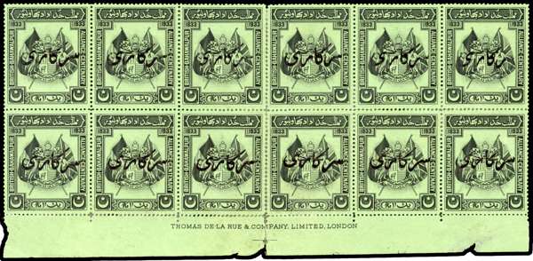 Officials. 1933 Centenary 1a overprinted SARKARI in manuscript imprint block of twelve. o.g., heavily reinforced and with some minor damage affecting the selvedge. The largest known multiple of the issue and a great rarity