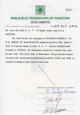 1947 local handstamp on KG V 25r affixed to card (148 x 220mm). Typewritten ‘Submitted for Approval’ at top with ‘Provisional Issue for 1947/ 13th August 1947’ beneath, two strikes of Mushir-i-Tasrifat handstamp, tick alongside the stamp and signed. A little soiled but unique, the only known 25r with Star & Crescent handstamp or overprint. PF Pakistan Certificate