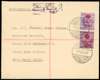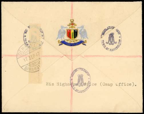 1947 registered envelope with local rubber handstamp in red on 2a KE VII and 2a KG V, tied by Deh-Rawal CDSs of 17 SEP 47. The reverse with State Crest, three strikes of Mushir-i-Tasrifat handstamp, and registration selvedge with part further CDS. A pretty cover. Neither stamp listed by I&A