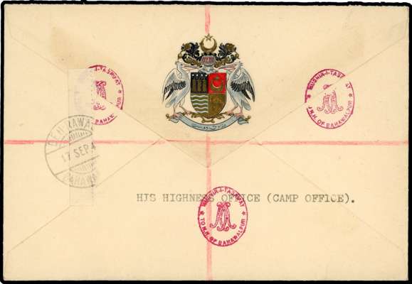 1947 registered envelope with KE VII 12a and KG V 1½a chocolate, local rubber handstamps in black, tied by Deh-Rawal CDSs of 17 SEP. Reverse with State Crest, three strikes of Mushir-i-Tasrifat handstamp, and registration selvedge with part further CDS. Neither stamp is listed in I&A
