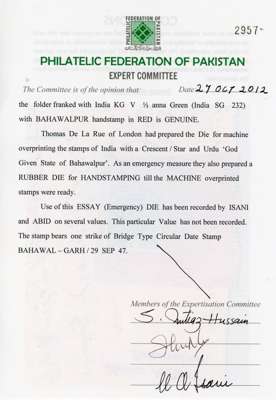 1947 wrapper bearing KGV ½a green with De La Rue rubber handstamp, cancelled by Bahawal-Garh CDs of 29 SEP 47. Very rare; PF Pakistan Certificate (2012)