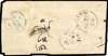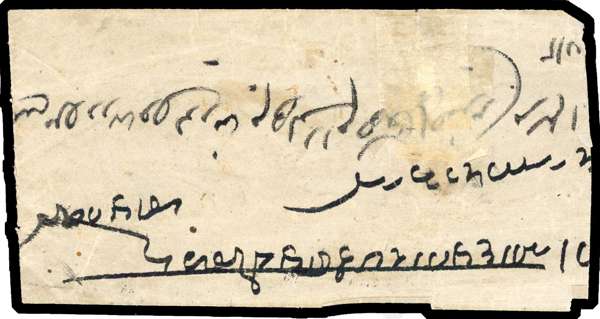 1860 stampless native cover, DELHIE CDS 18 AUG, green Lahore transit CDS of 21 AUG, and good BHAWULPORE arrival thimble CDS of AU 22. Torn and repaired with hinges, still a neat little cover