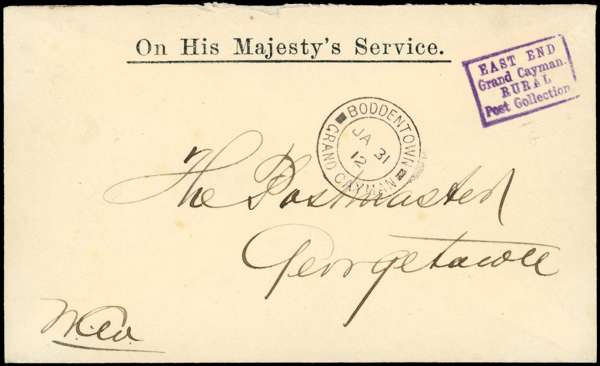 1912 Full strike of East End Rural Post hand stamp on stampless OHMS cover to the Georgetown Postmaster, with Boddentown transit cancel on face (31 JA 1912) and Georgetown receiver on reverse of the same date. Ex "Rew". Fine and attractive