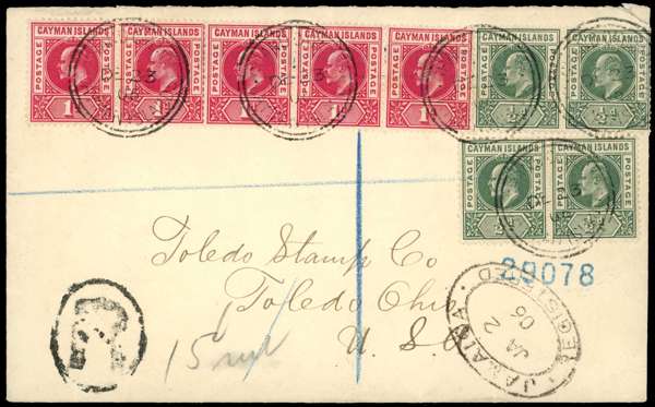 1903-21 Selection of covers with KEVII issues: 1903 with 2½ d KEVII issue on pre-printed cover to New York, 1906 registered cover with four ½d and five 1d KEVII issues to Toledo, Ohio, 1912 registered cover to Pittsburgh, with a single ½d and a block of four 1d KEVII issues cancelled with Cayman Brac cds (10 AP 1912), also registration label, etc., generally fine (5 items)