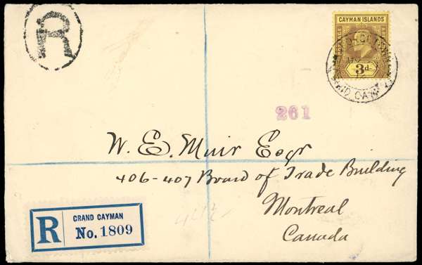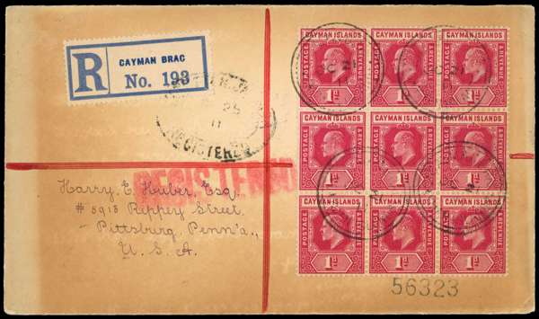 1908-14 Range of covers with 1907-09 KEVII issues; 1911 registered from Cayman Brac (21 OC 1911), unevenly toned, with a block of nine 1d carmine KEVII issues. 1914 registered to Canada with 3d purple on yellow paper KEVII, fine cover. 1909 registered to Boston with 6d dull and violet-purple KEVII, fine. 1908 OHMS to New York with 1s black on green paper KEVII cancelled Georgetown (5 JU 1908- thus SG 33), vertical fold not affecting stamp, corner removed, useful selection