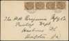 1910 Vertical strip of four ¼d brown issues attached horizontally on the top edge of a cover to Kingston, Jamaica. Cancelled with neat Georgetown cds (18 NO 1910), Kingston arrival on reverse (23 AU 1910), fine