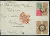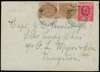 1910-17 Mixed usage of ¼d brown issues with KEVII issues: piece of parcel cover franked with six ¼d brown issues (horizontal crease affecting two of the stamps) and singles of the ½d and 1d KEVII issues, all cancelled with Georgetown cds (23 DE 1910). Inscribed "Book Post" and addressed to England, via Mobile Alabama, ex Watkin, Meredith. Also 1917 to Myers Wharf, Jamaica with a pair of ¼d brown issues and a single 1d KEVII issue (small crease and short perfs on the top edge of stamp), transit and arrival marks on reverse, (2 items)