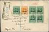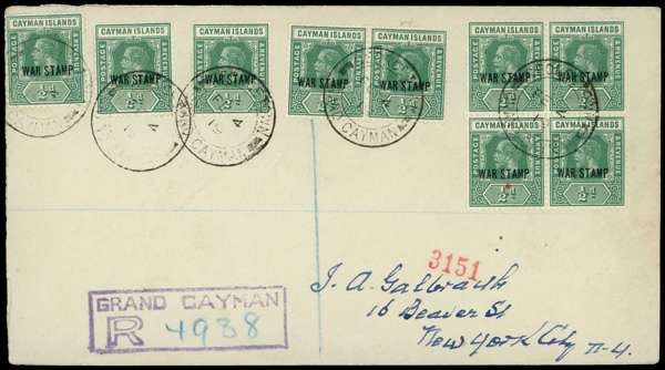 1919-32 Selection of covers bearing the 1919-20 surcharge issues: three covers with blocks of four of the 1½ d on 2d grey, one registered to Edinburgh, another registered from Cayman Brac to Amarillo, Texas. "W. T. Wilson" registered cover with plate pairs of the ½d "War Stamp" and the 1½ d surcharge (plate 5), left and right panes of the ½d, 1922 registered cover to Edinburgh with 3d KGV issue and a single ½d "War Stamp" etc. (14 items)