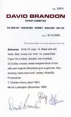 1918 (Feb) 1d black and red, type 10 ‘WAR TAX’ opt, lower marginal block of 4 with part centre guide, error OPT DOUBLE, ONE INVERTED, with the inverted impression misplaced to the left, part (dried) o.g., the left pair with slightly disturbed gum nevertheless a spectacular and very scarce multiple. Brandon cert (2006). SG 93a, cat £3600