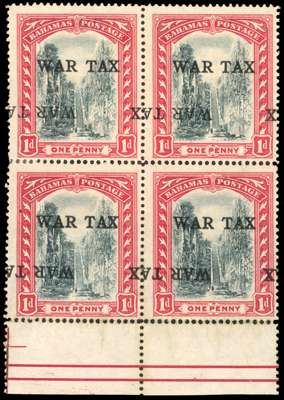Bahamas 1918 War Tax 1d block of 4 error overprint double one inverted