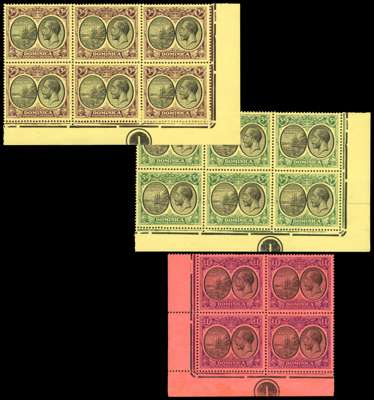 Dominica 1923-33 wmk MCA 3s, 5s, £1 plate blocks