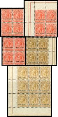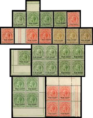 1918-20 War Stamp collection on stock pages, comprising apparently complete range of Part I listed shades (unchecked), similar range of ½d and 1d values in blocks of 4 (less ½d deep olive, 1d orange-vermilion), 1s light bistre-brown block of 4 and 1s pale bistre-brown lower left corner block of 9, and ½d from lower left corner showing constant variety ‘VAR STAMP’, mainly fine large part o.g. or o.g. SG 70/72, cat approx £1100