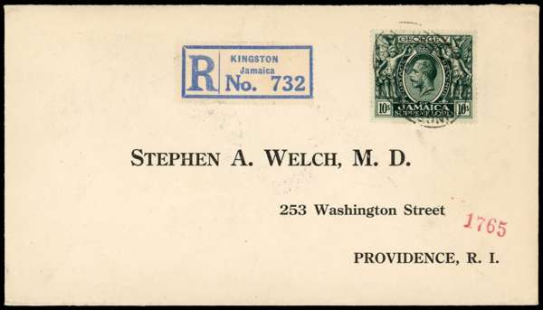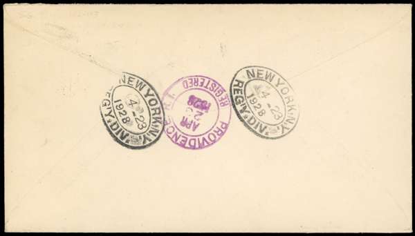 1928 (AP 17) registered cover from Kingston to USA, franked by 1921-29 10s myrtle-green, tied by registered oval with registration label at left, backstamped at New York and Providence (APR 23), a fine cover.