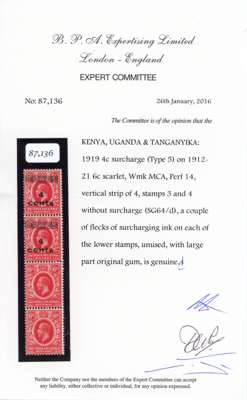 1919 4c on 5c scarlet, type 5 surcharge, vertical strip of 4, the lower pair error SURCHARGE OMITTED, fresh large part o.g. with the centre pair remaining unmounted, spectacular and rare in this form. BPA cert (2016). SG 64d, cat £2000+