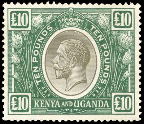 1922-27 £10 black and green, a couple of short perfs still an attractive and well-centred example of this handsome high value, large part o.g. SG 100, cat £15000.