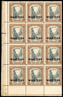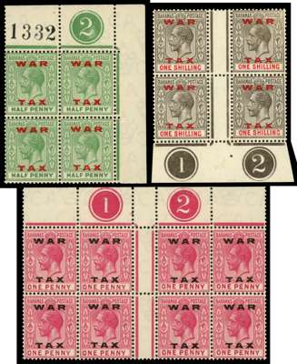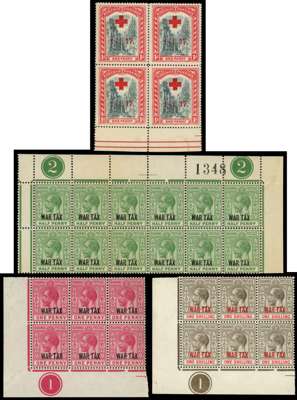 1917-19 War Tax range comprising basic set of 16 values plus 1917 Red Cross 1d block of 4 incl ‘Long stroke to 7’, 1918 (July) ½d, 1d and 1s plate blocks, 1919 (Mar) 3d lower left corner block of 12, 1919 (July) ½d plate block, and 1d and 1s interpane plate blocks, and 3d with wmk reversed, mainly fine large part o.g. to o.g. SG 90/105x, cat £660+