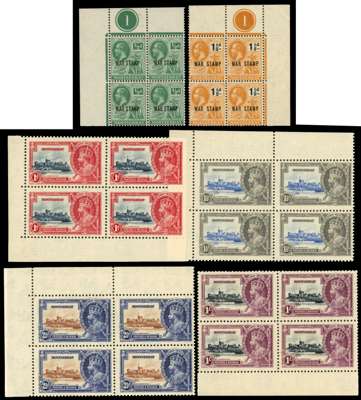 Very useful collection on stock pages comprising 1908-14 set to 5s incl 3d and 6d shades, 1916-22 set to 5s incl 1d and 3 shades, 1917-18 War Tax ½d trio (½d deep green plate block of 4), 1919 War Tax 1½d plate block of 4, 1922-29 set to 5s, 1932 Tercentenary set to 5s, and 1935 Silver Jubilee set in blocks of 4, large part o.g. to o.g., odd tiny gum tones but mostly fine and fresh. SG 35/47, 49/97, cat £750