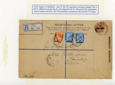 Spanish Currency. 1918 (23 FE) 30c on 3d brown registered p/s envelope (size ‘H’), addressed to Sheffield and uprated with 1914-26 20c on 2d and 25c on 2½d (2), tied by Tangier registered oval with London transit (2 MR) backstamp. Typical blemishes but a scarce commercial usage.
