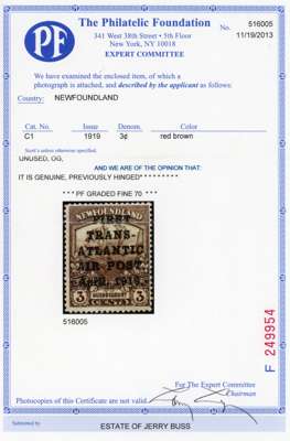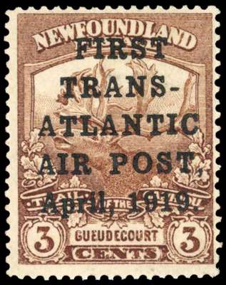 1919 (12 Apr) 3c brown ‘Hawker’ with type 69 ‘FIRST TRANS-ATLANTIC AIR POST, April, 1919.’ opt, initialed ‘J.A.R.’ (= J.Alex Robinson, postmaster) on reverse as always, o.g., trivial gum wrinkle mentioned for accuracy, with three handstamps on reverse, nevertheless a really fine example of the classic airmail rarity. BPA (2016) and PF (2013) certs. SG 142, cat £25,000