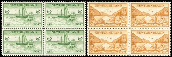 1933 Air set of 5 to 75c, blocks of 4, fresh unmounted o.g., a couple of minor gum bends still fine and attractive multiples. SG 230/234, cat £680+