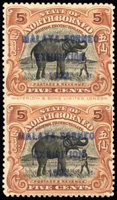 1922 Malaya-Borneo Exhibition 5c orange-brown, vertical pair, error IMPERFORATE BETWEEN, fine o.g., only 10 pairs are believed to have existed, one of which is in the Royal Collection and two were used. SG 258a, cat £2000