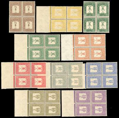 Postage due range comprising 1923 set of 5 plus 8m imperf pair and 2m imperf proof pair on yellow paper, 1924 set of 6, and 1928-44 set of 9 in blocks of 4 plus perf 15x14 1m (single) and 4m (block of 4), large part o.g. to o.g., the blocks with slight separation otherwise fine. SG D1/D5, D4a, D6/D11, D12/D20, cat £808+