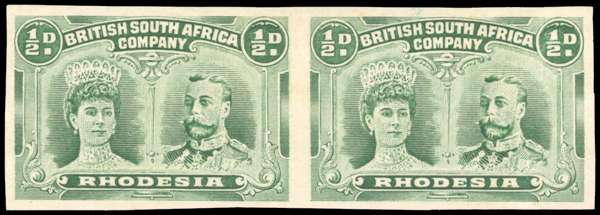 1910-13 ½d bluish green (RJL 5), error IMPERFORATE, horizontal pair from the sheet discovered at Umtali by H. Benson, fresh large part o.g., usual creasing (barely affecting left-hand stamp) still fine appearance and well above average. SG 120a, cat £15,000