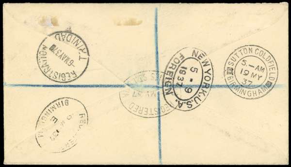 1937 (4 MY) registered ‘Wilson’ cover from Castries to England, franked by 1936 10s black and carmine, tied by registered oval ds with boxed registration h/s at left and airmail label at foot, backstamped at Trinidad (6 MAY), New York (9 May), Birmingham and Sutton Coldfield (19 MY), attractive and very scarce.
