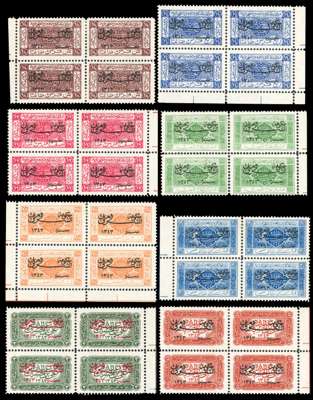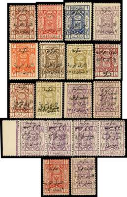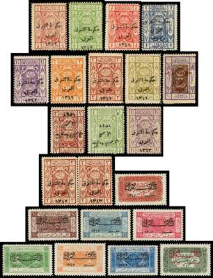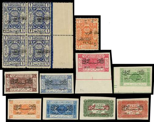 1923-25 overprints on Saudi Arabia, very useful collection on stock pages comprising 1923 (Apr) set of 7 plus ⅛p chesntut with inverted overprint and ¼p and 10p surcharges, 1923 (Sep) ½p on 1½p lilac plus additional examples with double overprint and double overprint, one inverted (strip of 4), 1924 (18 Jan) 1p block of 4 one variety ‘432’ for ‘342’ and 2p overprint in gold, 1924 (Mar-May) ½p and 1½p, 1924 (Sep-Nov) set of 9 plus ⅛p and ¼p with inverted overprint, 1½p and 3p with ‘1343’ for ‘1342’, and 1925 set of 8 as singles, blocks of 4, and imperf, large part o.g. to o.g. with several unmounted, cond varies but mainly fine. SG 89/142 btwn, cat £1352