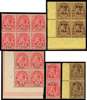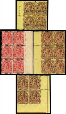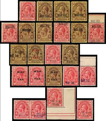 War Tax. 1917-19 collection on stock pages incl 1917 first printing 3d with opt double (SG 141ba), 3d with opt double, one inverted (SG 141bb), 1917 second printing 1d block of 6 with misplaced opt (straddling perforations) (SG 143 var), 1d upper marginal with opt double and additional opt in margin (SG 143e), 1d opt double (SG 143i), 3d with opt double (SG 144a), 3d with opt double, one inverted (SG 144b), 3d block of 6 with misplaced opt (straddling perforations) (SG 144 var), 1918 3d lower right corner block of 4 (SG 145), and 1919 1d opt double, mixed cond still a very good basis on which to expand, viewing highly recommended. SG 140/153 btwn, min cat £1655