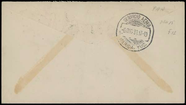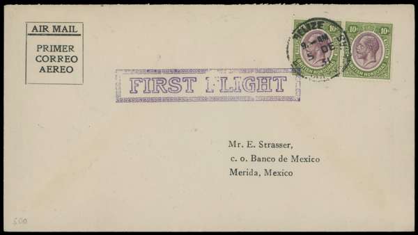 1931 (5 DE) airmail cover from Belize to Merida, Mexico, franked at 20c by 1922-33 10c dull purple and sage-green pair, tied by single despatch cds and violet ‘FIRST FLIGHT’ cachet with Merida arrival (6 DIC) backstamp. Flown on the first flight of the extended F.A.M. 5 route operated by Pan Am, and stated to be one of only five such covers. AAMC F5-125a