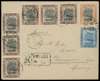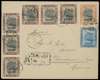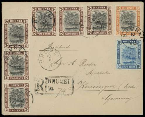 1913 (10 FEB) registered cover to Germany, franked at 25c by 1908-22 2c black & brown (6), 5c black & orange, and 8c blue & indigo-blue, all tied by five strikes of despatch cds with matching registration h/s at foot. Backstamped at Labuan (12 FE) and Singapore (17 FE). Attractive and scarce.