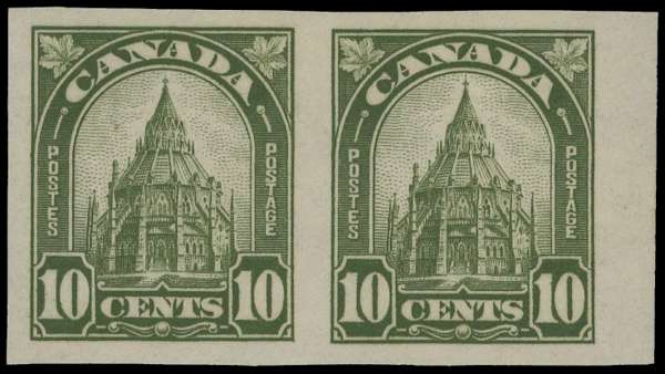 1930-31 10c olive-green, horizontal pair, IMPERFORATE, large part o.g., slight gum wrinkle does not detract from very fine fresh appearance. SG 299a, cat £1800