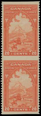 Special Delivery. 1927 60th Anniversary of Confederation 20c orange, vertical pair, IMPERFORATE HORIZONTALLY, fresh unmounted o.g. SG S5 var, cat £250+