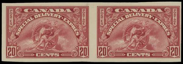 Special Delivery. 1935 20c scarlet, IMPERFORATE horizontal pair, fresh unmounted o.g., very scarce, only 75 pairs originally existed. SG S8 var, cat £850