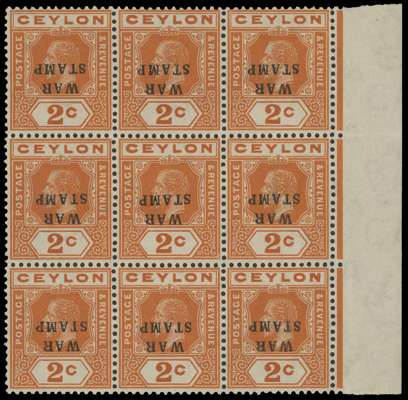 1918-19 War Stamp 2c brown-orange, type 54 opt, error OVERPRINT INVERTED, right marginal block of 9, fine o.g. with the stamps mostly unmounted. BPA cert (1958). SG 330a, cat £630+