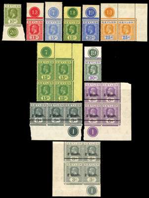 1921-32 set to 20r, Script wmk, 28 values incl 10c, 12c, 15c, 20c, 25c, 30c, 50c and 1r die II, also a small range of plate number examples and 1926 2c on 3c and 5c on 6c incl plate blocks and 2c on 3c surch double, large part o.g. to o.g., somewhat mixed condition but much is fine. SG 338/357, 361/362, cat £900+
