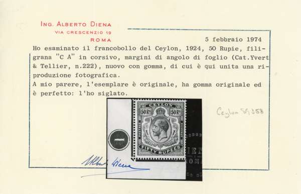 1921-32 50r dull purple, Script wmk, lower left corner example with plate number ‘1’, fine o.g., very scarce in this positional form. Diena cert (1974). SG 358, cat £850