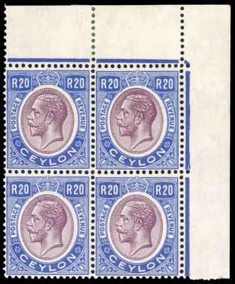 1927-29 20r dull purple and blue, upper right corner block of 4, large part o.g. with the stamps remaining unmounted, attractive and rare in this positional form. SG 367, cat £1300