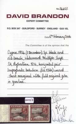 1934 (1 Dec) 1pi black and red-brown, horizontal pair with sheet margin at left, error IMPERFORATE BETWEEN, fresh unmounted o.g. One of the great rarities of Cyprus, from a sheet found at Limassol in Oct 1937 which had the second vertical line of perfs omitted, with just 10 pairs possible. Brandon cert (2006). SG 136b, cat £21,000