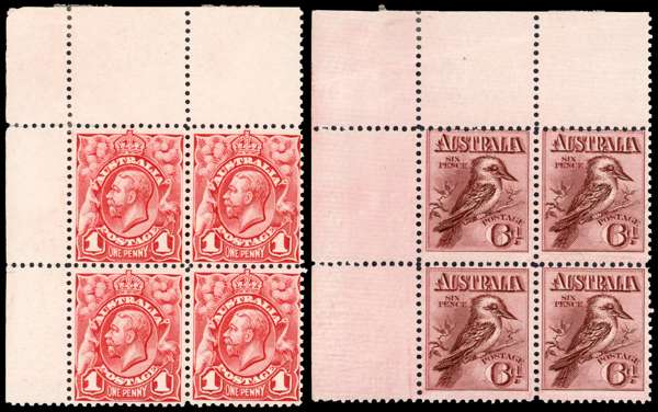 1913-14 engraved KGV 1d red and 6d claret 'Kookaburra', in matching upper left corner blocks of 4, fresh o.g. (all stamps unmounted except one 1d). 6d block rather off-centre as often, with marginal creasing, still a very attractive pair of blocks, with impressive provenance. Ex Duke of Gloucester. S.G. 17, 19 cat £320++ BW 59/60