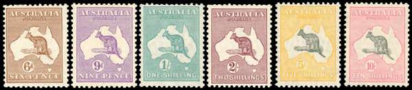1929-30 Kangaroo 5th wmk short set of 6 to 10s, fresh large part o.g. 9d with crease though the key 5s and 10s superb examples, lightly hinged and with excellent colour and perforations. S.G. 107/12 cat £1,000+