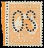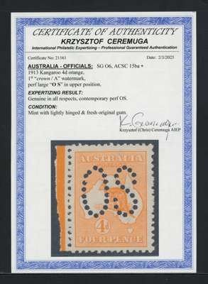 Official. 1913 4d orange, wmk 2, type O1 ‘OS’ puncture, part interpane margin at left, fine o.g. Ceremuga cert (2025). SG O6, cat £350