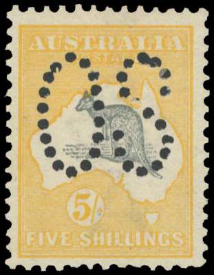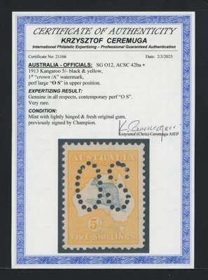 Official. 1913 5s grey and yellow, wmk 2, type O1 ‘OS’ puncture, large part o.g., shortish perfs at foot but above average centring. Ceremuga cert (2025). SG O12, cat £1700