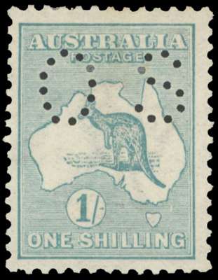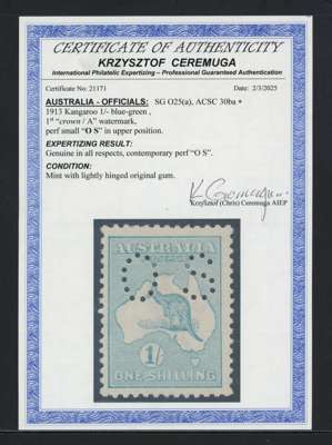 Official. 1914 1s emerald, wmk 2, type O2 ‘OS’ puncture, large part o.g. Ceremuga cert (2025). SG O25, cat £325