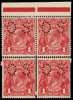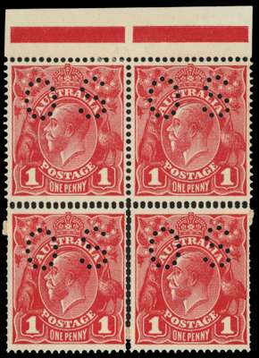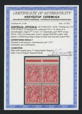 Official. 1914-21 1d carmine-red, wmk 5, perf 14¼x14 (comb), type O2 ‘OS’ puncture, upper marginal block of 4 with both horizontal pairs showing die II and I se-tenant, the lower pair exceptionally with Double Perforations, large part o.g., an attractive and rare multiple. Ceremuga cert (2025). SG O39/h, cat £1200++ (BW 71ic, cat A$3000+)