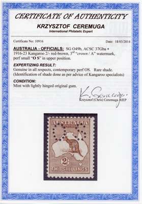 Official. 1915-28 Third Watermark Perforated "OS" 2s red-brown (aniline), centred to upper left, fine large part o.g. S.G. O49b, £2,250; BW 37Gba Ceremuga cert (2014)