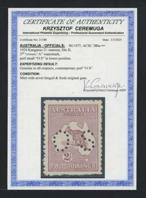 Official. 1923-24 2s maroon, wmk 6, type O2 ‘OS’ puncture, unmounted o.g., slightly rough perfs at foot but well centred and scarce unmounted. Ceremuga cert (2025). SG O77 (BW 38ba, cat A$1250)