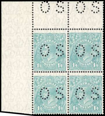 Official. 1926-30 1s 4d turquoise, wmk 7, perf 13½ x 12½, perf 'O S', an UPPER LEFT CORNER BLOCK OF FOUR with 'White flaws in emu's tail and upper frame' (BW 130d) on R1/2 and showing additional perfins in top margin, very fine unmounted o.g. (hinged in top margin). A rare and desirable positional multiple of this elusive stamp, with impeccable provenance. Wonderful. S.G. O111 cat £2,400++
