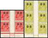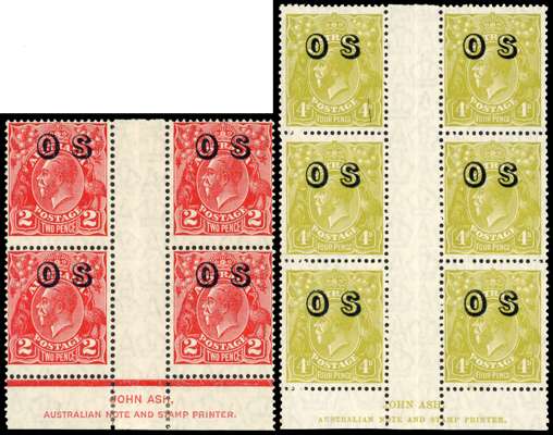 Official. 1932-33 2d golden scarlet, 4d yellow-olive, wmk 7, perf 13½x12½, type O4 ‘OS’ opt, lower marginal blocks of 4 (2d) or 6 with full ‘JOHN ASH’ imprint, large part o.g. (2d) or unmounted o.g., lightly folded through gutters as usual still a fine and scarce pair. SG O125, O126, cat £264++